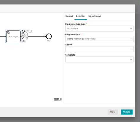 This type of methods is called by the Service Tasks in order to automate the process of publishing. The needed method can be chosen inside the modeler inside Neowise. It is available in the Definition tab of the Service Task. [