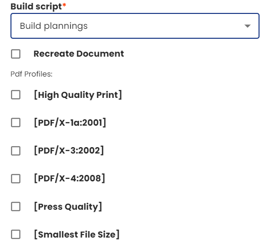 The method generates the panel with combo box to choose the available build script, checkbox to decide if a document should be recreated and available InDesign pdf profiles (as above).