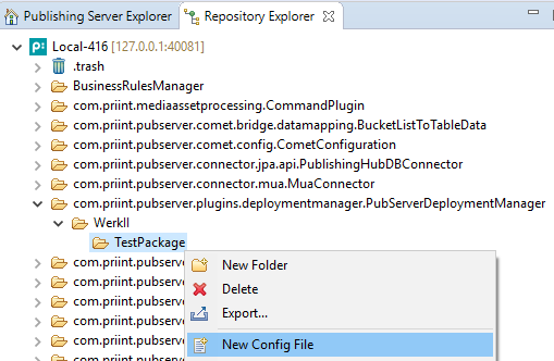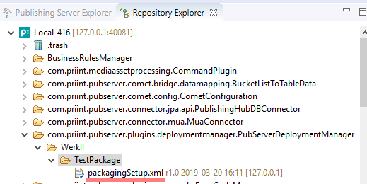To create a package, the user must create a folder in the repository folder of the Deployment Manager plugin. This folder includes other folders which contain uploaded files like Publishing Server plugin, libraries or import scripts. This is a standard functionality of ISON Repository Explorer.