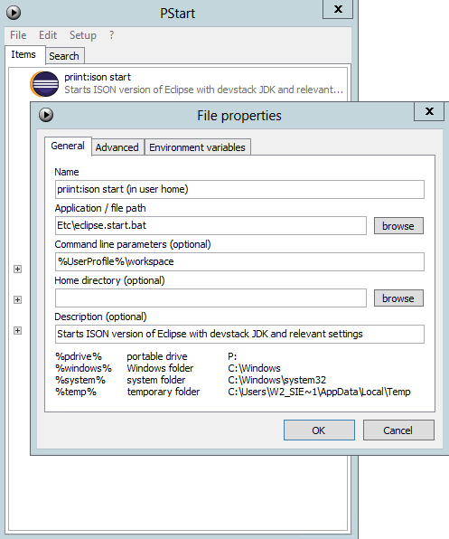 Open PStart window for that, and use the command “****Edit->Add file…” or “Edit->Edit…”. In a new entry select etc\eclipse.start.bat as application. In File properties change “Name” to “priint:ison start (in user home)”. Change “Command line parameters (optional)” to %UserProfile%\workspaceas here: