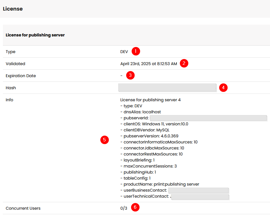 | 5 | Info | License for publishing server 4 - Type: PROD - Publishing Server Web Address: https://planner.kontoso.com:8080 - Publishing Server Id: 47:D3:EB:B5:34:CF:DF:91:2F:F6:94:92:5E:41:96:05:4F:98:CD:4F - IPIM Connector Max Sources: 0 - JDBC Connector Max Source: 0 - REST Connector Max Source: 1 - Layout Briefing: 1 - Max Concurrent Users: 10 - Publishing Server: 1 - Table Config: 1 - Customer name: Kontoso Ltd. - Customer number: 15628 - Partner Name: priintPartner - Partner Number: 25739 - Product Name: priint:publishing server - Business Contact: purchase-dept@kontoso.com - Technical Contact: it-admin@kontoso.com | Features of the license currently installed in the publishing server. |