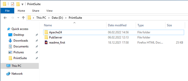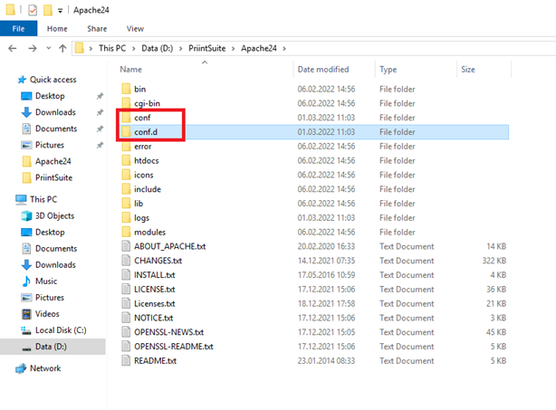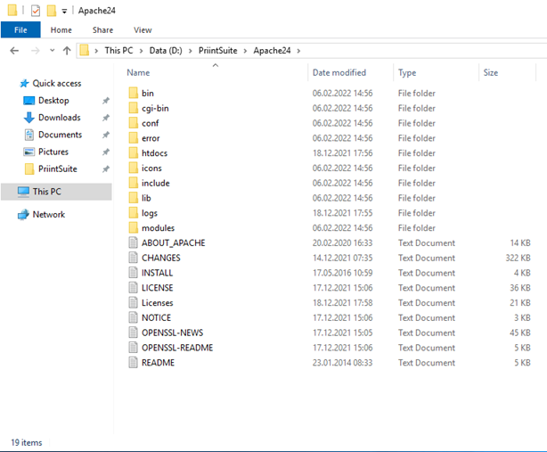 The Apache on Windows comes as a .zip archive. Just unzip it wherever you want. In this documentation, we will use the directory D:\PriintSuite\ to unzip all contents of the .zip archive into. After you unzipped the archive, you get the following directory: D:\PriintSuite\Apache24. This directory will be the working directory of the Apache web server. In case you use a different structure, you will have to change the paths later in the configuration. You can leave it like that or rename it to something else. We will leave it like this. This is how the directories structure looks like after unzipping.