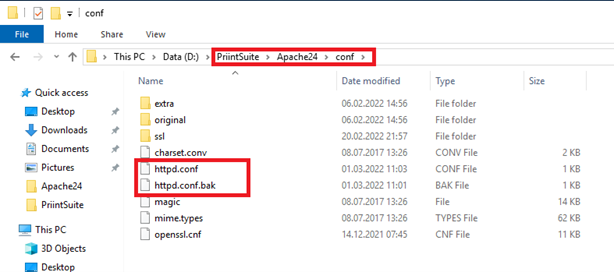We unzipped the archive earlier to the directory D:\\PriintSuite\\Apache24. First, we want to preserve the original config under D:/PriintSuite/Apache24/conf/. We’re just going to change the ending of the file from .conf to .conf.bak After that, we take the httpd.conf that we provided and copy it to D:/PriintSuite/Apache24/conf/.