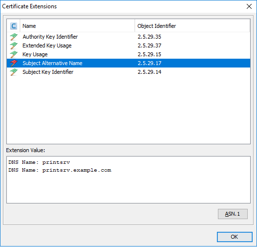 Inspect the certificate’s extension values. Especially the value for “Subject Alternative Name”. It should contain one or more DNS entries along with optional other entries. The DNS entries are the fully qualified domain names supported by the certificate.