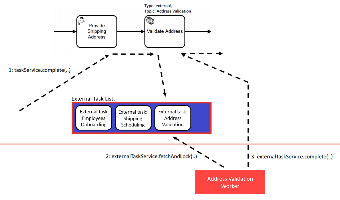 Upon completing the assigned task, the external worker can notify the process engine to proceed with the process execution after the service task (step 3).