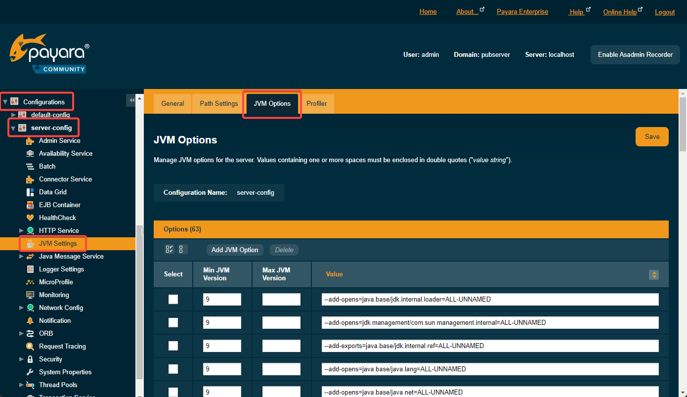 Configurations -> server-config -> JVM Settings -> JVM Options