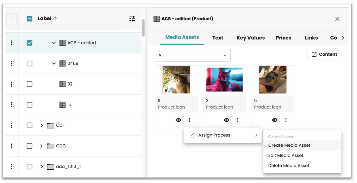 Action: Click the three-dot menu (⁝) next to the selected item, or click on the Content button on the top right or in the content entity tab on the right side.
