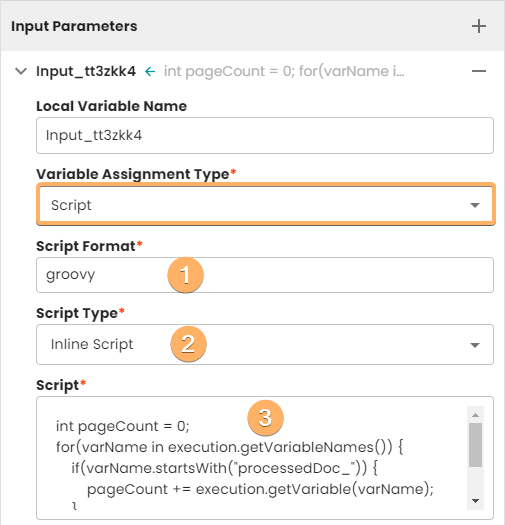 - After choosing inline script you will be able to write your own script in Groovy. The script source code can be loaded from an external resource by providing path to the file.