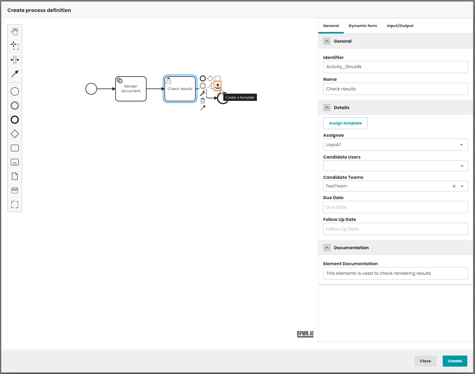 User task has the ability to assign a template element from the list of existing templates. To assign a template to a task, select the user task and in the General -> Details tab, press the "Assign template" button.