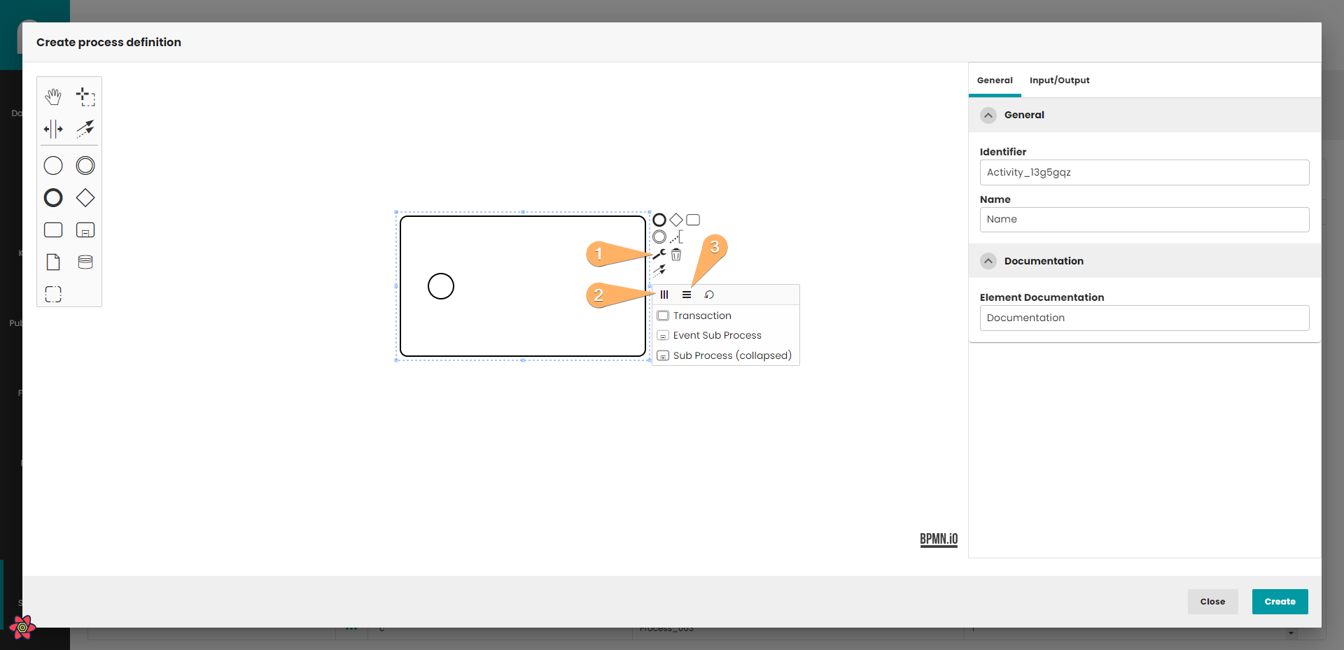 - Create process definition button. When you click on this button, process definition will be saved in database. The process do not need to be finished. If you edit process definition, the Create button is replaced by the Update button. Update button create new version of process definition, so you can easily go back to previous version of process.