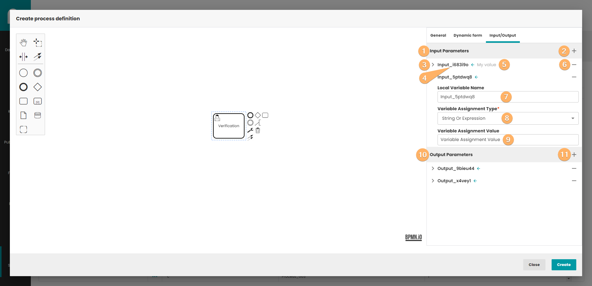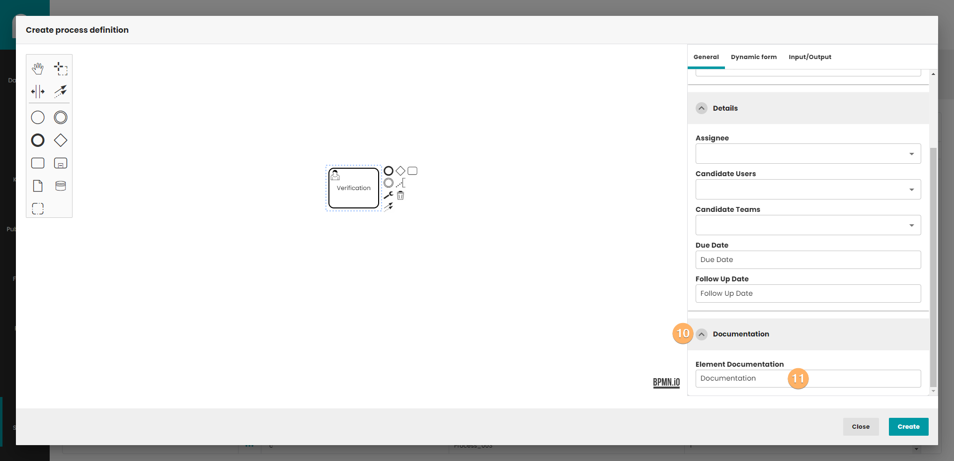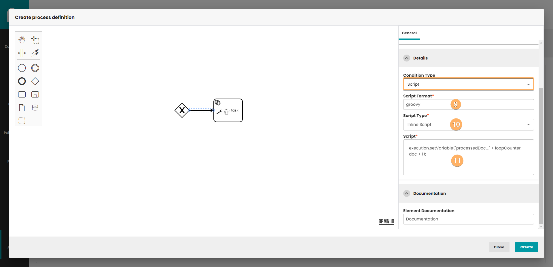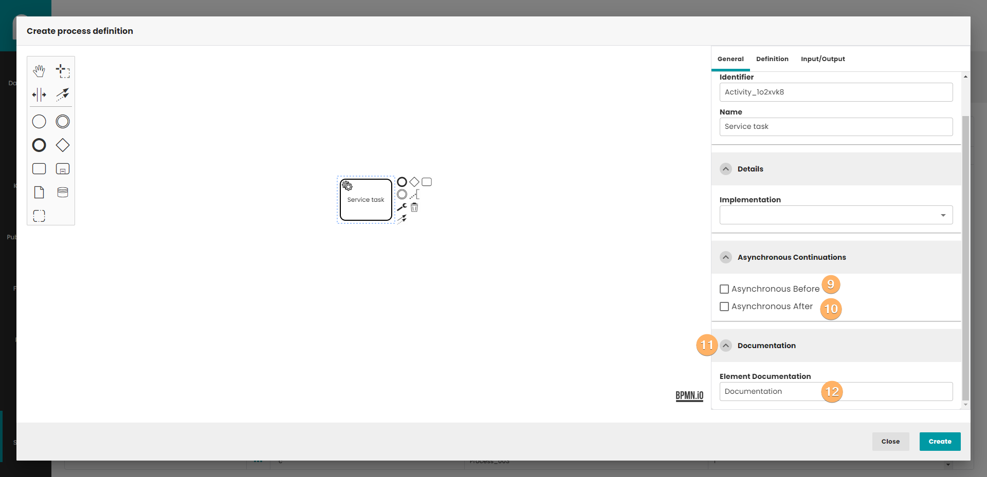 - Create process definition button. When you click on this button, process definition will be saved in database. The process do not need to be finished. If you edit process definition, the Create button is replaced by the Update button. Update button create new version of process definition, so you can easily go back to previous version of process.