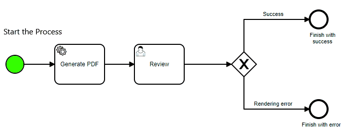 This element is represented by a circle in the diagram. It is used to start the process instance. It contains a number of functionalities that can be set during process startup. Those functionalities can may affect the process fate.