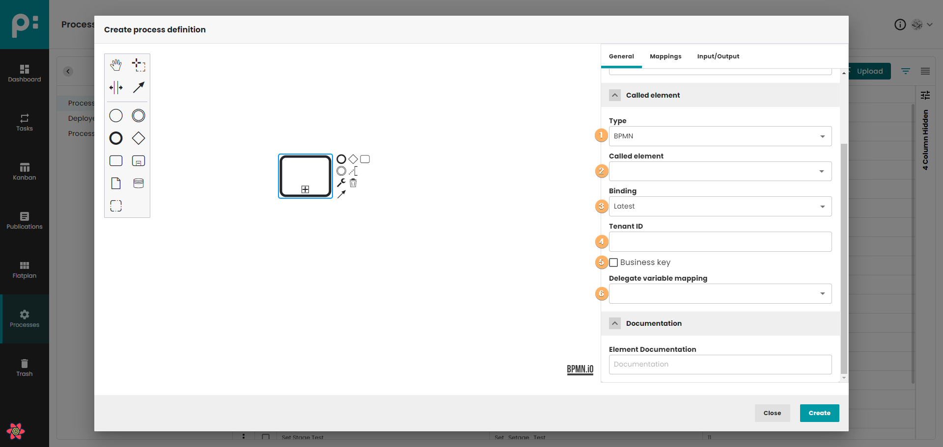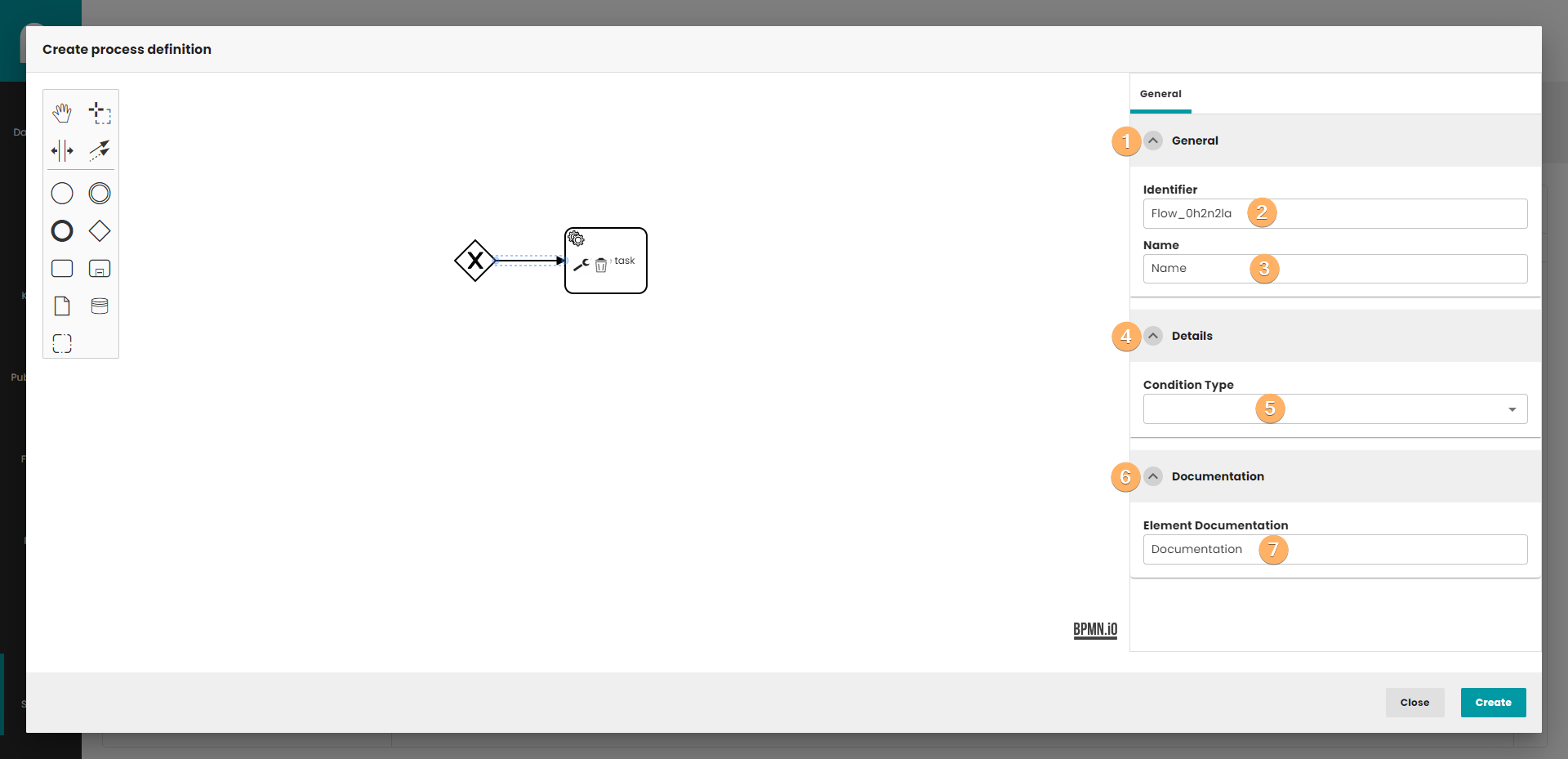 - Canvas with process definition. You can use When you click on this field, you can edit basic information about process definition.