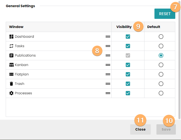 - The checkbox Visibility controls whether a window is included in the menu. The Checkbox Default controls, which window is shown when you first login (or cleaned up your cookies).