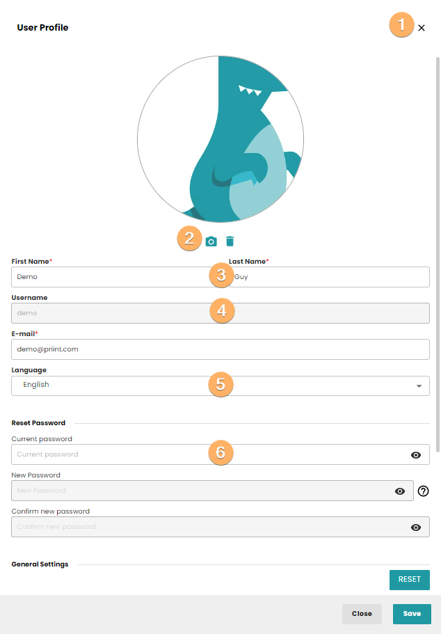 - Below the divider Reset Password the user can change her/his own password. The old password must be entered, and the new password even twice. The question mark button will show the hints for the password rules.