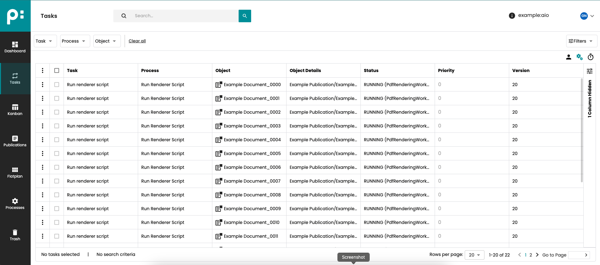 - The search filters the tasks by the task name. With an empty search field every task relevant for the current user is displayed. For more detailed filtering, please use the standard filter functionality below the search bar.